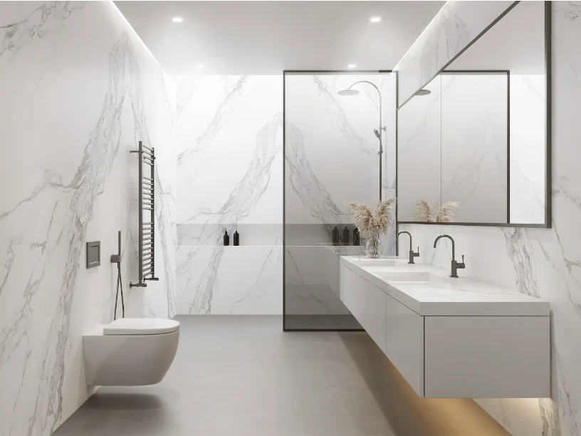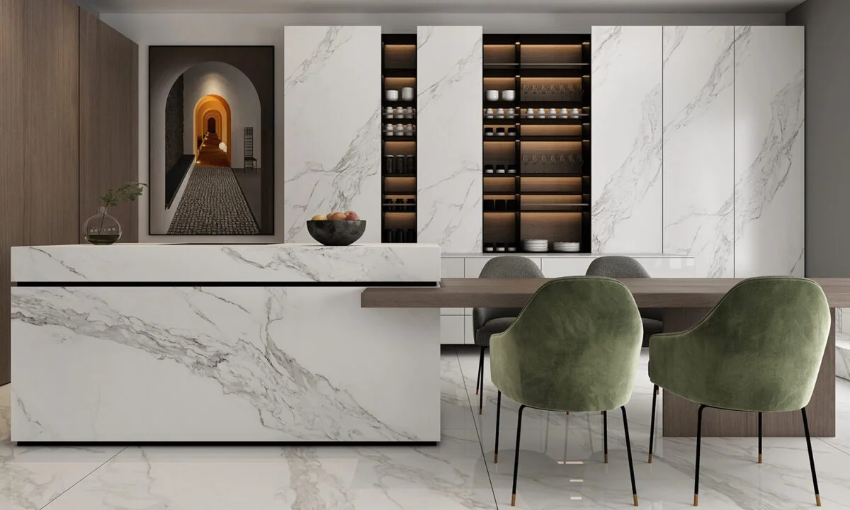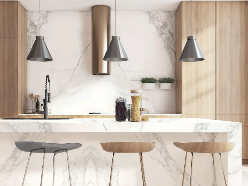 Porcelain is a strong, durable and heat resistant surface which can be used for both outdoor and indoor needs. Whilst emulating the look and feel of marble closely, Porcelain has added practicality, including being easy to maintain, and withstanding outdoor weathering.